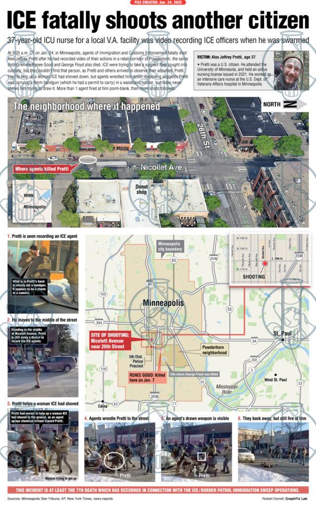 On Jan. 24, agents of Immigration and Customs Enforcement fatally shot Alex Jeffrey Pretti, a man who was an ICU nurse at the Minneapolis Veterans Affairs hospital, who had been monitoring their activities.