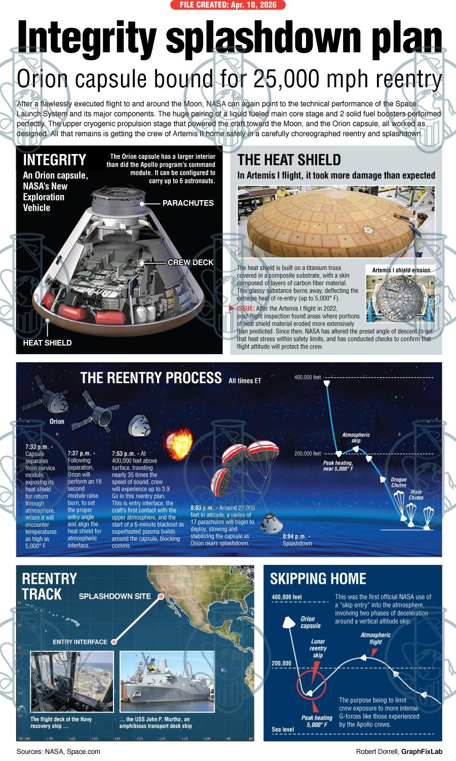Artemis II’s crew capsule will separate from the service module, then begin its reentry flight profile, reaching speeds as high as 25,000 mph and heat on the shield as high as 5,000° F, with splashdown targeted off the coast of San Diego at about 8:07 p.m. ET, which will end what has been a flawless mission to the Moon and around it, and home.