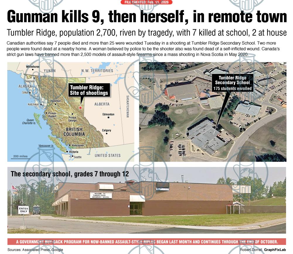 Canadian authorities say 7 people died and more than 25 were wounded in a shooting at Tumbler Ridge Secondary School in British Columbia, Canada. Two more people were found dead at a nearby home. A woman believed by police to be the shooter also was found dead of a self-inflicted wound.
