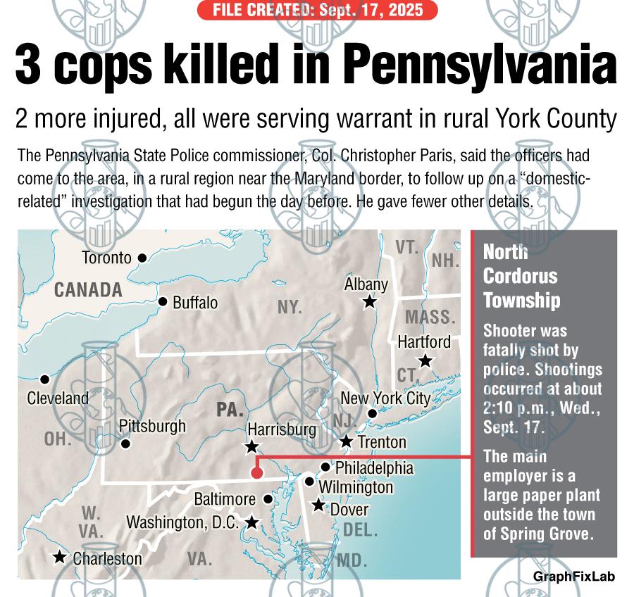 Three police officers were fatally shot and 2 more were in critical condition, and the shooter was fatally shot by additional police, after an attempt the serve a warrant in rural York County, Pennsylvania, on Wed., Sept. 17, went awry.