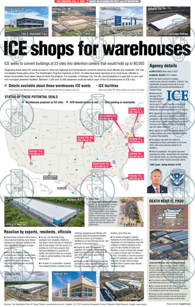 At 23 sites across the U.S., DHS is trying to purchase vacant warehouses with plans to convert them to large detention centers where people put into the ICE deportation pipeline would be held. Several sites have been rendered unavailable, either by local political officials’ actions or by public backlash causing owners to back away from deals with DHS.