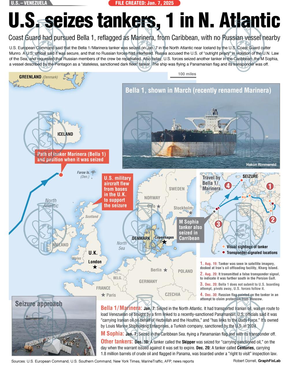 U.S. European Command said that the Bella 1/Marinera tanker was seized on Jan. 7 in the North Atlantic near Iceland by the U.S. Coast Guard cutter Munro. Also today, U.S. forces seized another tanker in the Caribbean, the M Sophia. This graphic carries the details.