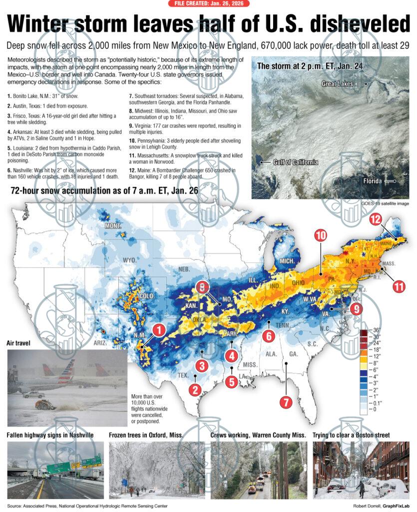An impactful 3-day snowstorm wreaked havoc across a 2,000-mile stretch of states, knocking out power, causing traffic-related and other deaths and causing thousands of flight cancellations. This map rounds up those effects.