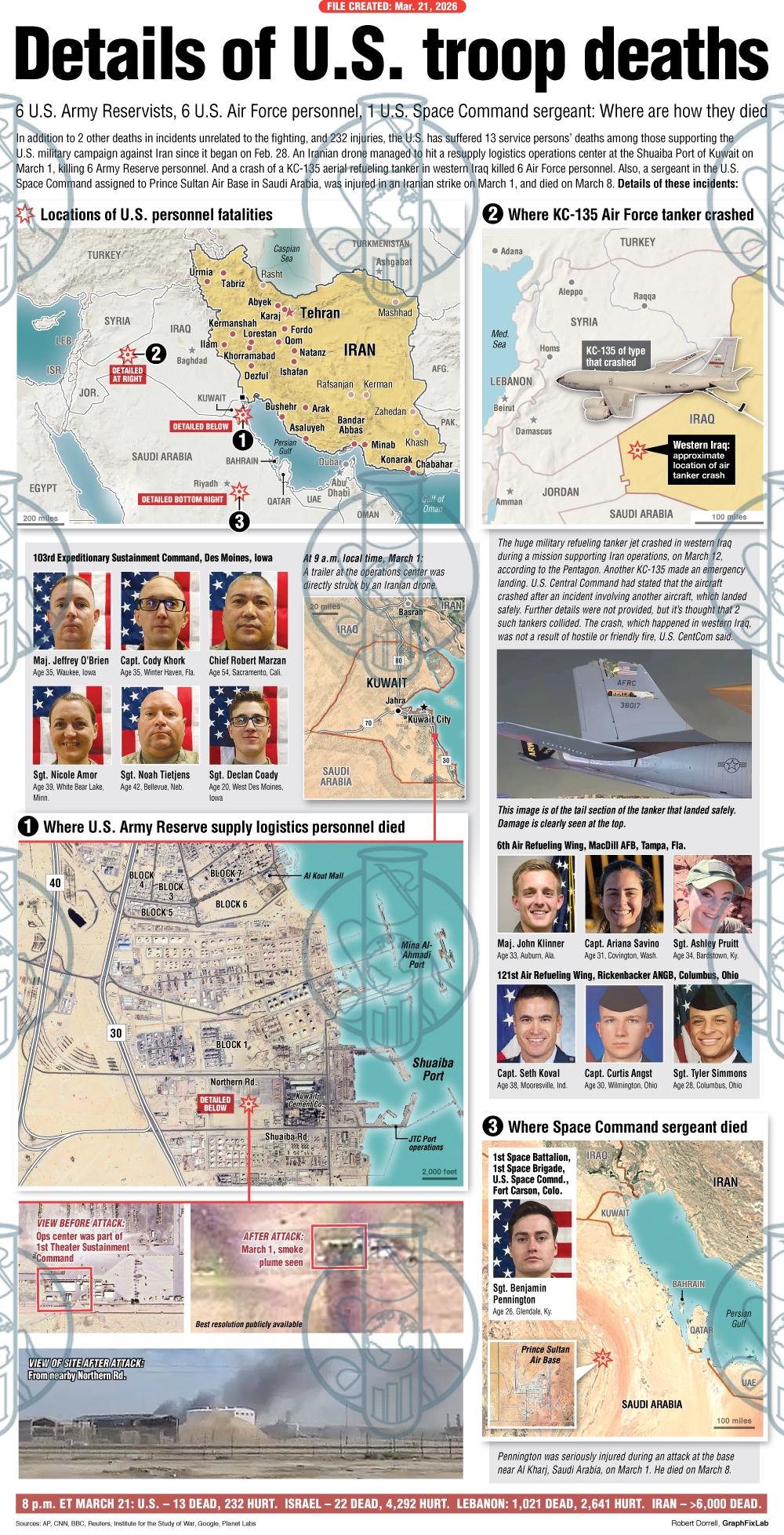 Maps and photos show details of the 13 U.S. military personnel deaths in the Iran operation, – where are how they died – 6 U.S. Army Reservists, 6 U.S. Air Force personnel, and 1 U.S. Space Command sergeant.