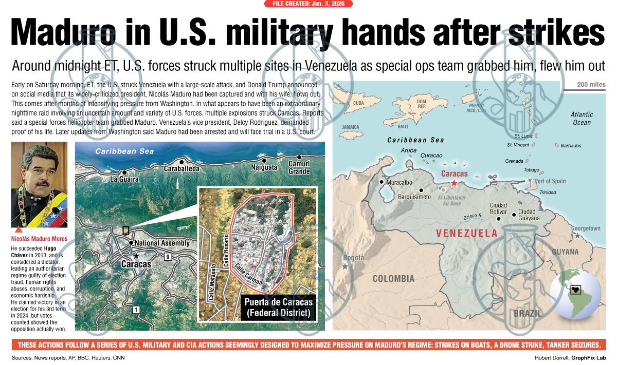 Early on Saturday morning, Jan. 3 (ET), the U.S. struck Venezuela with a large-scale attack, and Donald Trump announced on social media that its widely-criticized president, Nicolás Maduro had been captured and with his wife, flown out. This comes after months of intensifying pressure from Washington. In what appears to have been an extraordinary nighttime raid involving an uncertain amount and variety of U.S. forces, multiple explosions struck Caracas. Reports said a special forces helicopter team grabbed Maduro. Venezuela’s vice president, Delcy Rodriguez, demanded proof of his life. Later updates from Washington said Maduro had been arrested and will face trial in a U.S. court.